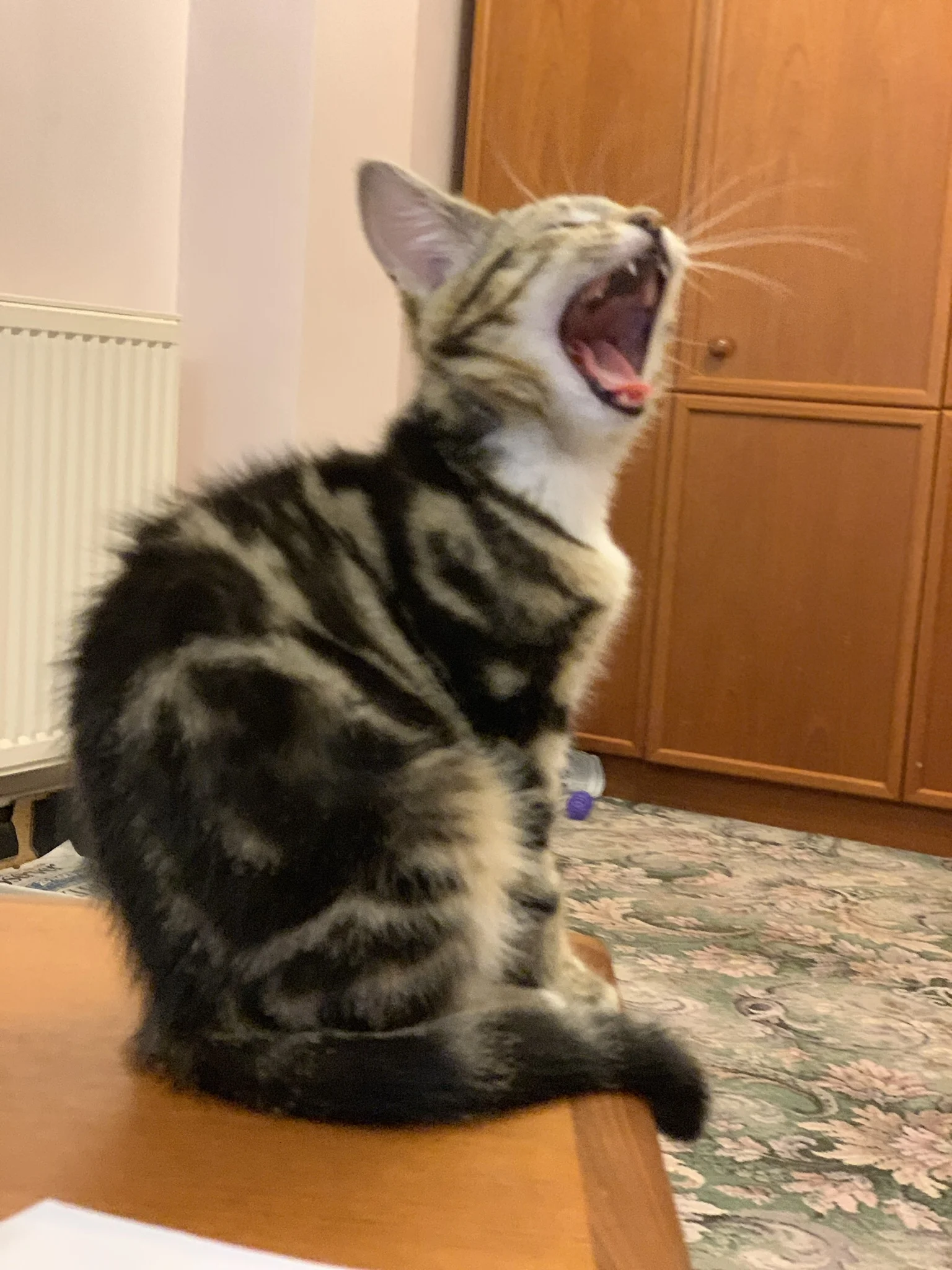 It was not raining quite as much when I left, but enough for scrambled eggs on toast to be an excellent lunch. Replenish what I used up. I watched an episode of The Blacklist, then went to sit with the kittens for an hour. Blue was very good and just wanted hugs, whereas Brooke and Barnaby decided to be mental. They just chased each other around and fought, then Brooke started picking up toys, carrying them around, and growling at Barnaby whenever he got near her. When Blue jumped down to investigate I took my opportunity to leave, and nobody even escaped into the bathroom!